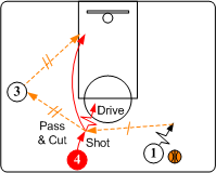 Ball ReversalPoint O1 passes back to trailer O4. Trailer O4 has options of shooting , driving or passing to wing O3 and making a basket cut. |