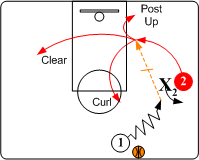 High Post Flash - Post RubPost initiates a high post rub cut ("UCLA") action by breaking up to free throw line and setting a back pick for O1. Wing O2 looks to feed O1 on basket cut or posting up. |