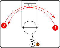 Dribble ClearWhen the wing is overplayed, the point dribble clears the wing. Wing O2 makes a backcut to the basket looking for a backdoor feed. If the wing O2 does not receive a pass on the initial backcut, O2 then has options of posting up or clearing out to opposite wing for reversal pass shot or curling up to free throw line for shot. |