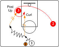 Turnout - Base CurlWhen defender X2 trails wing O2 off O3's base screen, O2 curls around the screen looking for feed from point for possible lay up. If point O1 does not pass to O2 on curl, O1 takes ball to wing on dribble and looks to feed O3 posting up. |