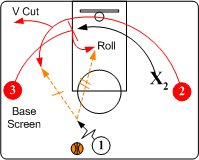 TurnoutWing O3 (big) sets a base screen for opposite wing O2 (small). Point O1 looks to feed O2 coming off O3's screen feed O3 on roll if defense switches. When the defender X2 cheats over the screen, O2 should make a "V Cut" and fade to corner for shot. |