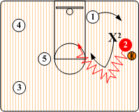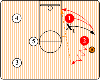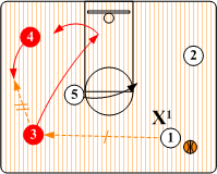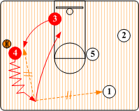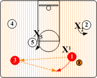 When the defender tries to cut off the wings dribble out, the wing makes a spin (reverse pivot) or behind the back dribble and drives to the basket. |
