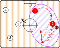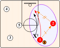 When O2 is unable to pass feed O1 on basket cut, O2 dribbles out. O2 passes to O1 breaking out to wing and makes a hard cut to the basket. O1 looks to pass to O2 cutting to the basket. If not open O1 dribbles out and the Give & Go actions is repeated. |