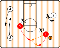 Whenever the defender cuts off the return pass to O1 from the post, O1 cuts to the basket. Post O5 looks to feed O1 cutting to basket or O2 braking out. |