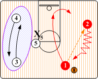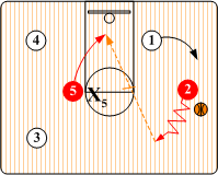If/when the dribble cannot pass to cutter breaking out to wing or on back cut, the post steps out as a pressure release. O1 passes to post O5 and gets a return pass. Give & Go action continues with O1 passing to wing O2 and making a basket cut. |
