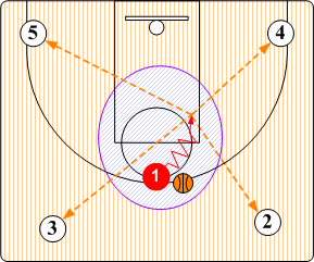 ![]() With players spread out in each corner, it creates a isolation situation for O1 to attack the defender one-on-one. |