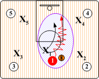 ![]() Whenever, defender X1 cuts off O1's dribble penetration, O1 passes the ball to one of the corner players and then creates a lead to receive a return pass. |