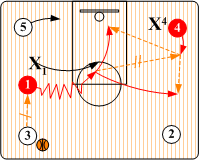 Kick Out Pass: When O1's dribble penetration is stopped, O1 also has a pass option to baseline corner player O4 stepping out. |